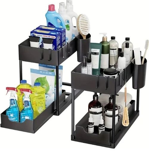 Kitchen Bathroom Under Sliding Cabinet Basket Organizer 2 Tier Under Sink Organizer With Hooks Hanging Cup and Chopstick Holders